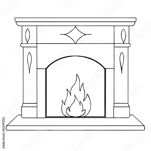 Illustration of a classic fireplace with decorative elements and a stylized flame design inside the hearth