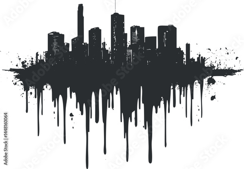 Gritty urban skyscrapers abstract ink splash city grunge backdrop isolated on white background