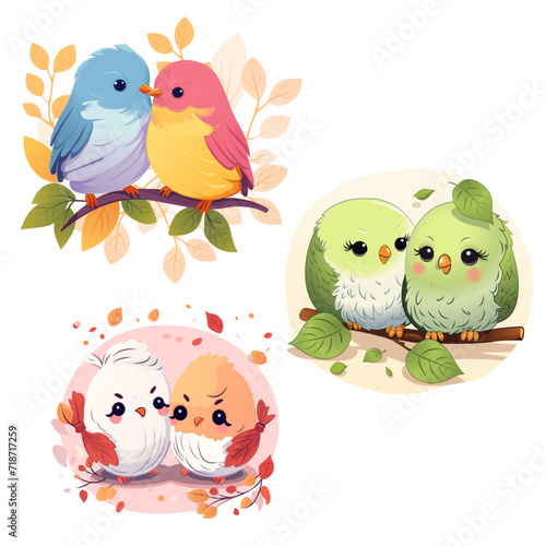 Love Birds Romance: Charming illustrations capture the delicate beauty of avian affection, with pairs of pastel-colored lovebirds sharing tender kisses, sweet flowers, and heart shaped symbol