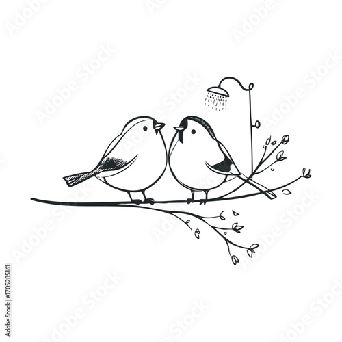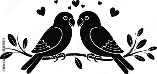 Charming illustration of two affectionate lovebirds perched on a delicate branch