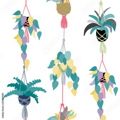 Cartoon Color Macrame Hangers for Home Plants Seamless Pattern Background. Vector