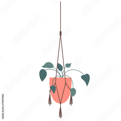 Hanging planter with vines and lush greenery in a stylish macrame hanger. Vector illustration
