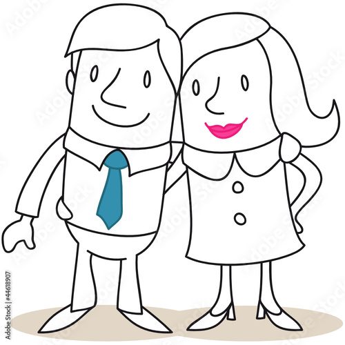 Minimalist outline illustration of a smiling cartoon bride and groom holding hands, perfect for wedding invitations and celebration designs.