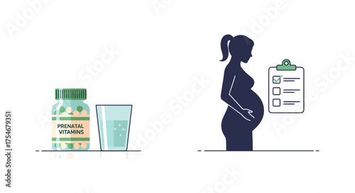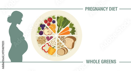 This illustration depicts a pregnant woman's silhouette alongside a balanced food plate, emphasizing essential nutrition for maternal and fetal health.