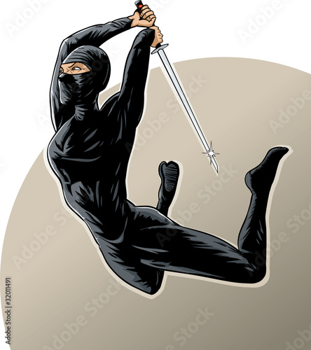 Silhouette illustration of a ninja warrior leaping in action with a katana