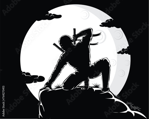 black and white silhouette vector design, night view with a large moon and a black ninja sitting on a rocky cliff while holding a sword that is still in its sheath