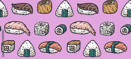Sushi Salmon and Ebi Nigiri Pattern on Colorful Background Vector