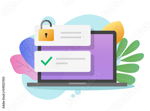 Locked door with unlock text next to a laptop displaying a web interface. Ideal for digital access, cyber security, online privacy, password protection, secure login, data security, simple flat