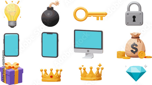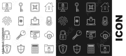 Set Lock on computer monitor, Casting keys, Bunch of, Password protection, Mobile with fingerprint scan and repair icon. Vector
