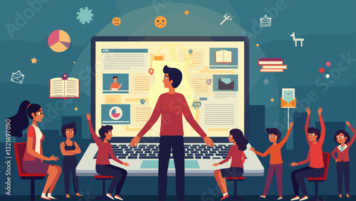 Discover knowledge and unlock new ideas with an open book held by a hand against a vibrant blue geometric background perfect for educational content, Generative AI.