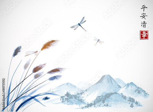 Leaves of grass, dragonflies and far mountains. Traditional oriental ink painting sumi-e, u-sin, go-hua. Contains hieroglyphs - peace, tranquility, clarity, happiness