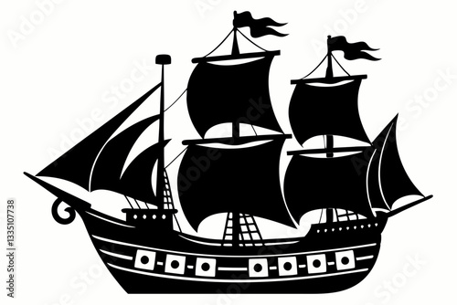 Silhouette of a majestic galleon sailing ship with detailed rigging and sails against a white background