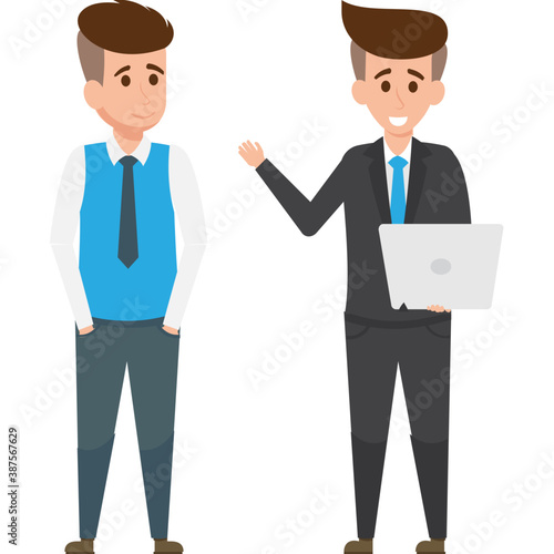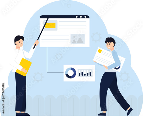 A business people standing next to an office building, target board, and calculator, illustration of explaining business performance to investors regarding business targets and financial