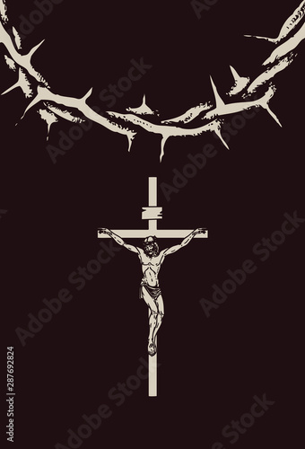 Jesus Christ at a grave silhouette. Christian symbol of resurrection and faith. Minimalist black and white religious graphic