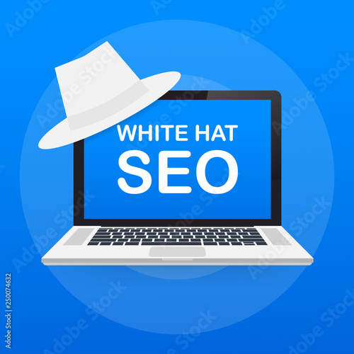 White hat seo banner. Magnifier, and other search engine optimization tools and tactics