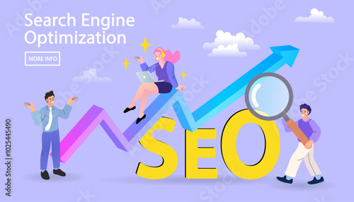 engine optimisation for website, seo ranking, optimization marketing. Promotional web banner. Cartoon flat vector illustration with people characters.