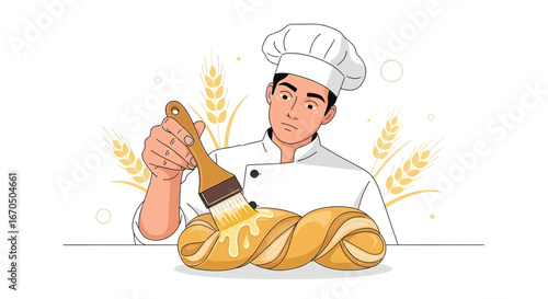 Detailed illustration of baking tools including a loaf of bread, rolling pin, wheat stalk, and chefs hat, perfect for culinarythemed designs