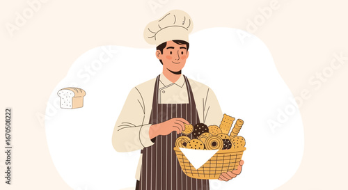 Baker chef carrying freshly baked bread and pastries illustration for food business branding silhouette