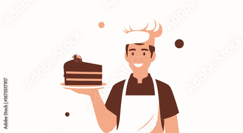 Female pastry chef mixing rich chocolate batter in a bowl, preparing delicious desserts and sweets, illustration.