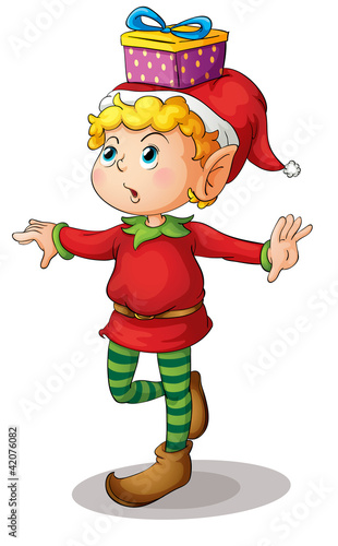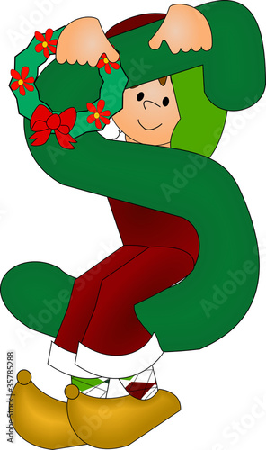 Christmas elf postcard element. Illustration of elf in green costume holding candy cane and dancing. Christmas, fairy tales, cartoon character. Can be used for postcards, posters, greeting cards