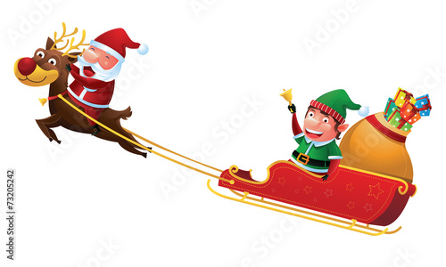 Christmas character greeting vector design. Merry christmas text with happy santa claus and elf characters riding sleigh element for xmas eve celebration. Vector illustration.