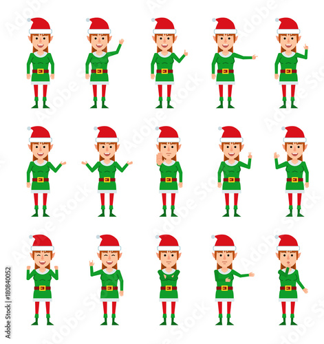Christmas elf girl creation set. Various gestures, emotions, diverse poses, views. Create your own pose, animation. Flat style vector illustration
