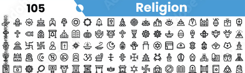 Sacred vector web line icons depicting religious symbols, faith, spirituality, worship, and diverse cultural beliefs with reverence.