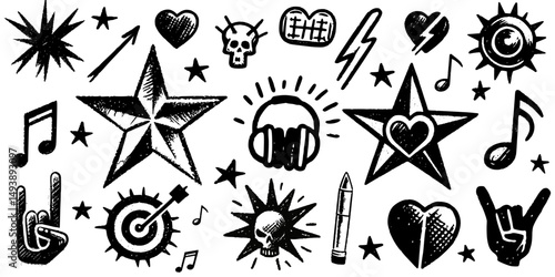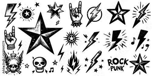 Classic Punk Rock Graphics, Visually striking punk rock graphics, showcasing classic icons like stars, lightning bolts, and rock music symbols