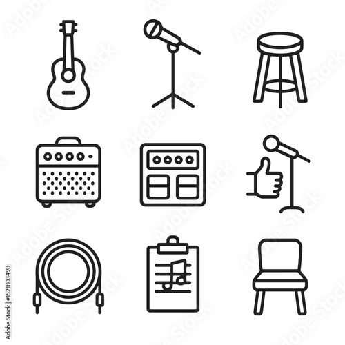 Acoustic Set Icons. Outline icon set of live acoustic sets: acoustic guitar, mic on boom stand, stool, amp combo, pedalboard,