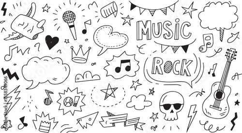 Music Doodle Icon Set with Punk Rock Guitar, Microphone, Skull, Thunder, Arrow, Crown, and Hand Drawn Graffiti Style Elements on Transparent Background