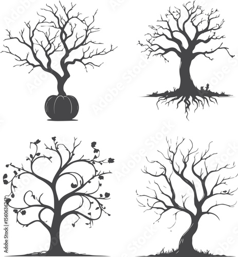 Halloween creepy tree vector art color line art amp silhouette illustration