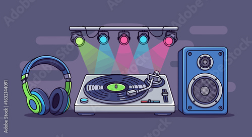 Illustration of a dj setup with a turntable headphones speaker and stage lights in a stylized design
