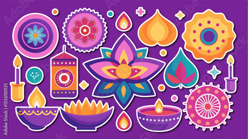 Colorful Diwali Festival Stickers and Decorations Arranged on a Purple Background for Festive Celebrations vibrant