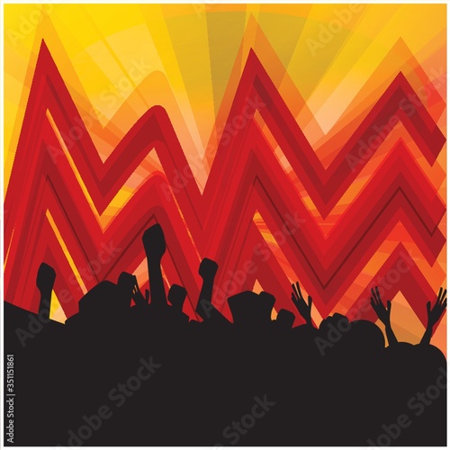 Silhouette of a crowd with raised hands and confetti falling on a white background celebration scene
