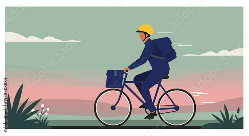 Illustration of a young man with a backpack riding a yellow bicycle downtown street
