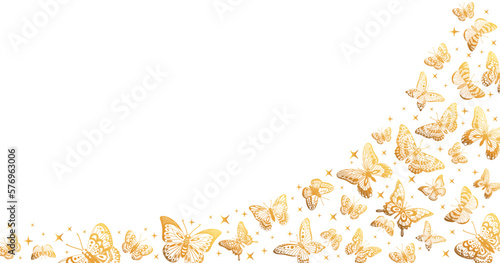 Cartoon golden butterflies poster. Gorgeous flying butterfly pattern, shiny exotic moths flat vector background illustration