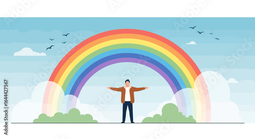 Illustration of Rainbow with Fluffy Clouds icon. Vector 3d Arch Isolated on Sky Color Background. Cute Cartoon for Summer Spring Season