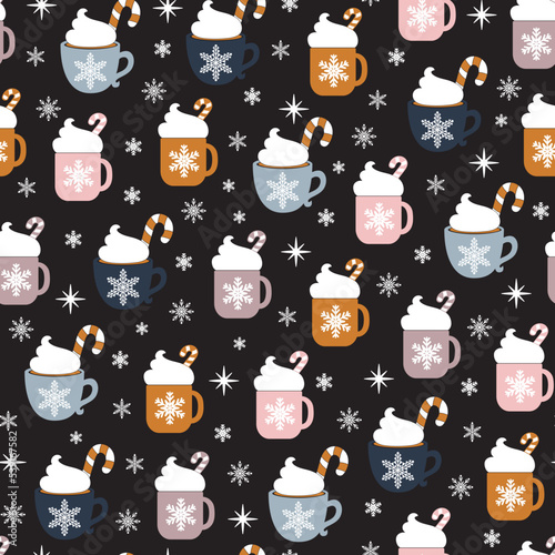 Christmas seamless pattern with cup hot cocoa on a dark background. Happy New Year background. Season greeting. Vector Christmas illustration.