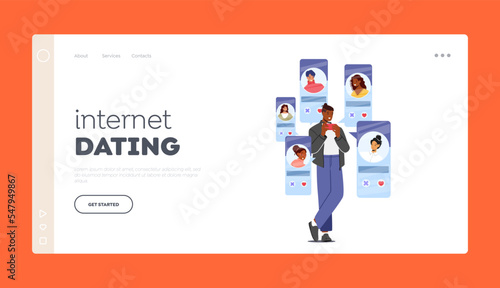 Internet Dating Landing Page Template. Character Dating Online Use Service App On Phone Screen. Virtual Relationships