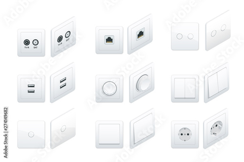 Realistic socket. AUS, Arg, Chz, Nzl socket vector illustration. Adapters. Isolated electrical equipment on wall. Type I. Multiple standards socket for plug. Ac adapters for electrical appliances