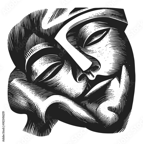 A striking portrait illustration in black and white with strong textures and dynamic contrasts. This artwork features an expressive facial representation.