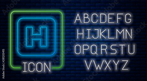 Glowing neon Hospital sign icon isolated on brick wall background. Neon light alphabet. Vector Illustration