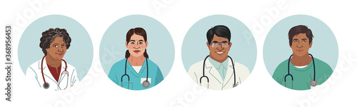 Indian Medics. Medical Characters. Doctors and nurses round portraits, team of doctors concept, medical office or laboratory. Modern flat vector concept digital people vector illustration