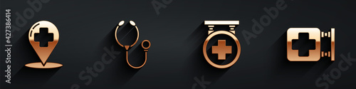 Set Map pointer with cross hospital, Stethoscope, Hospital signboard and Hospital signboard icon with long shadow. Vector