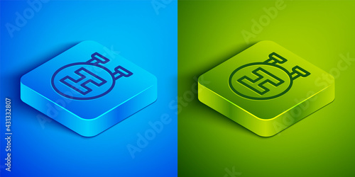 Isometric line Hospital signboard icon isolated on blue and green background. Square button. Vector