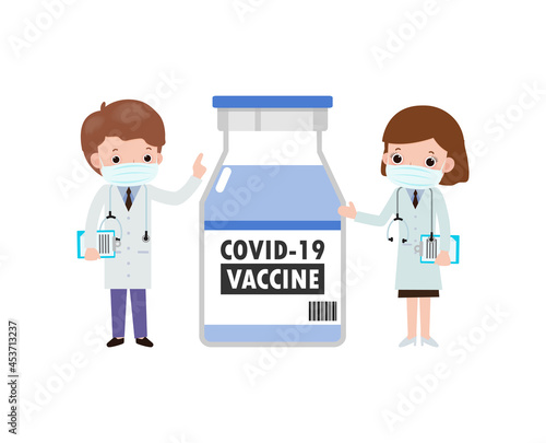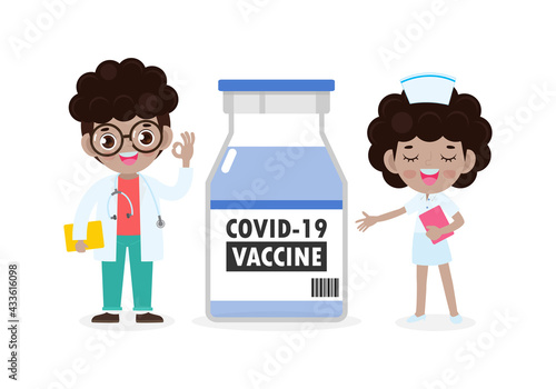 COVID-19 or coronavirus (2019-nCoV) vaccine concept. american african Doctors team with Vaccine vial, Medical staff doctor and nurse, group of medics isolated on white background vector illustration