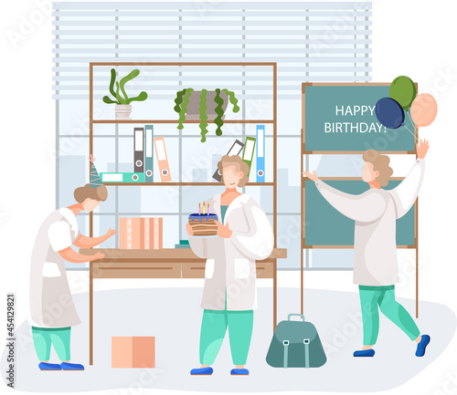 Birthday party in hospital, fun entertainment in medical office. Doctors organize holiday congratulate colleague. Interaction, entertainment at workplace. Team of medics giving gifts and cake