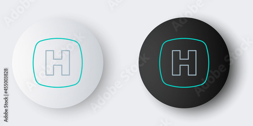 Isometric line Hospital signboard icon isolated on black background. Turquoise and pink circle button. Vector