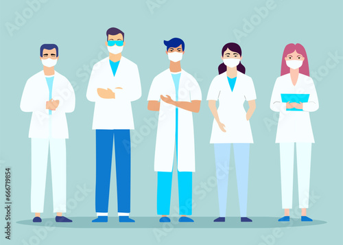 A team of doctors and medical workers in uniform. Wearing medical respiratory masks to protect against viruses and infections. The concept of medical care and assistance to people. Vector