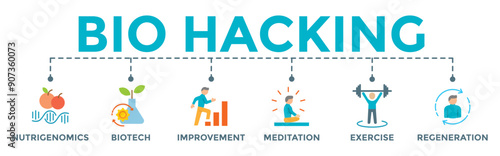 Biohacking banner web icon vector illustration concept with icon of nutrigenomics, biotech, improvement, meditation, exercise and regeneration